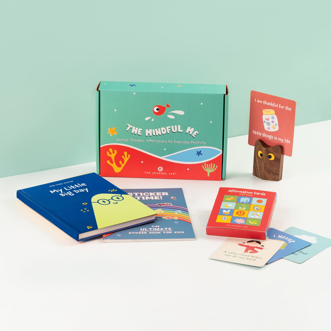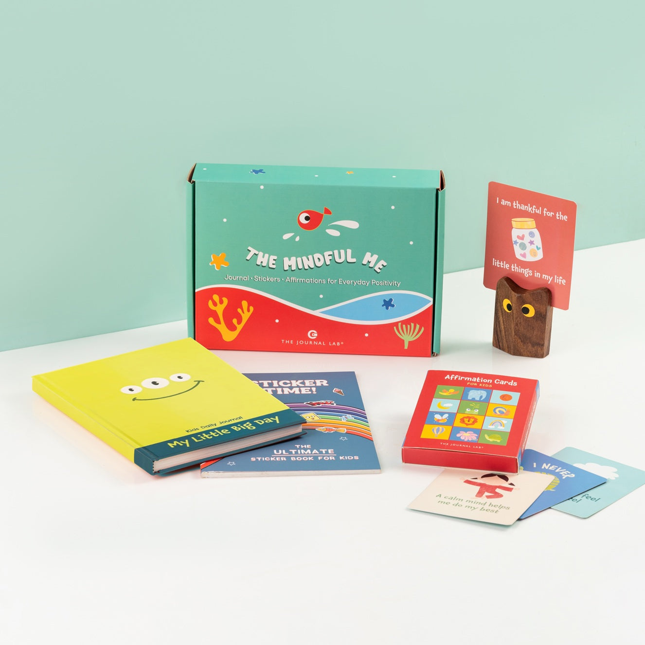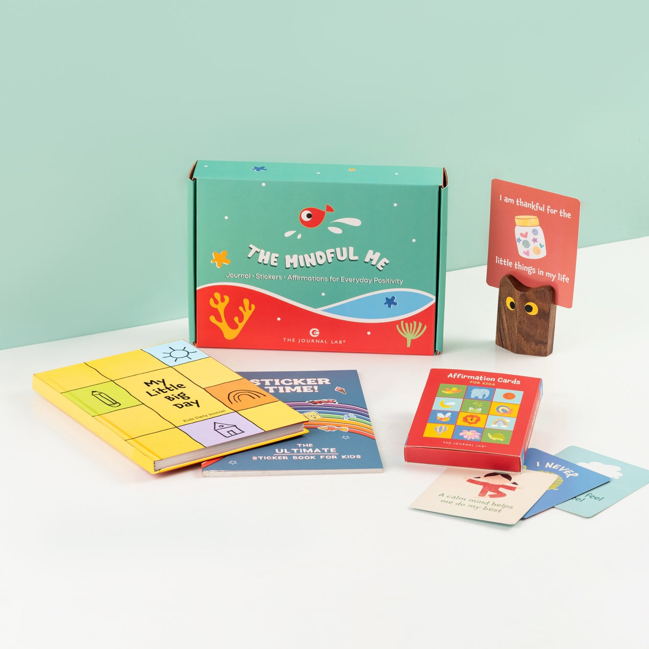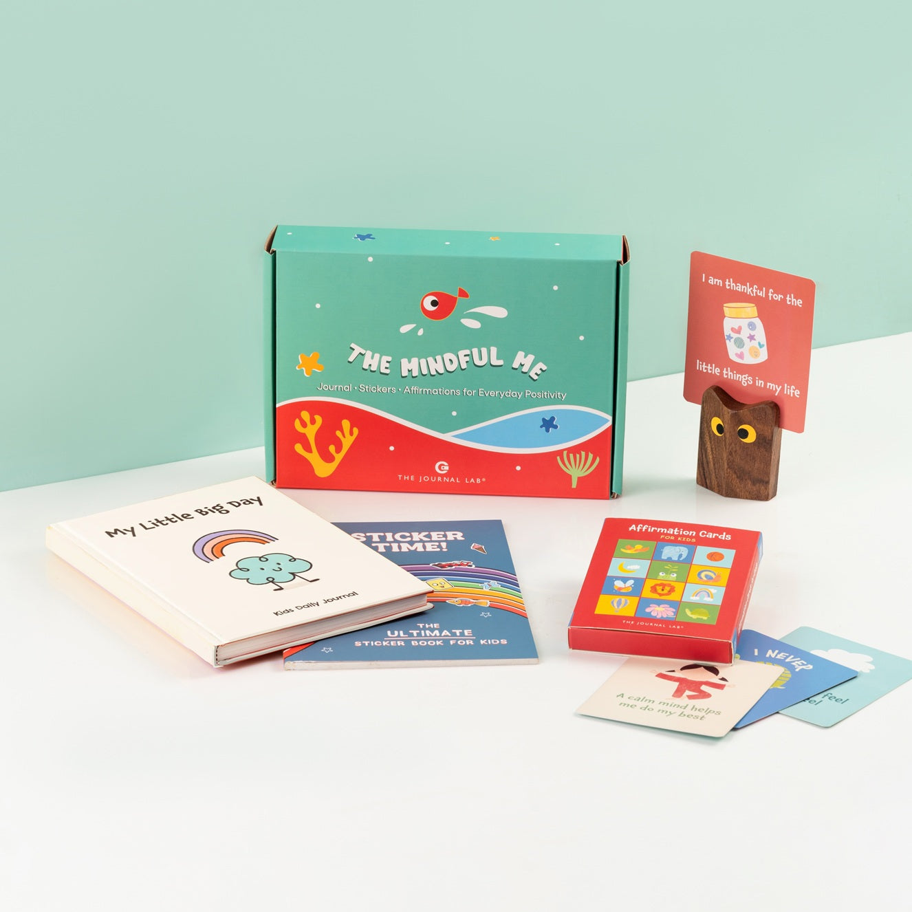 It includes a daily journal for kids, sticker book, affirmation cards set, and a wooden card holder - everything they need to make each day a little brighter.
