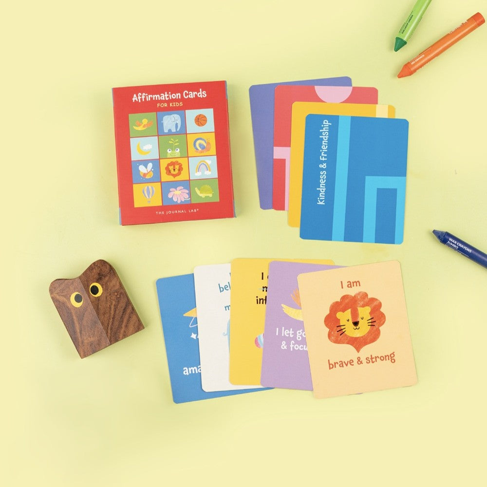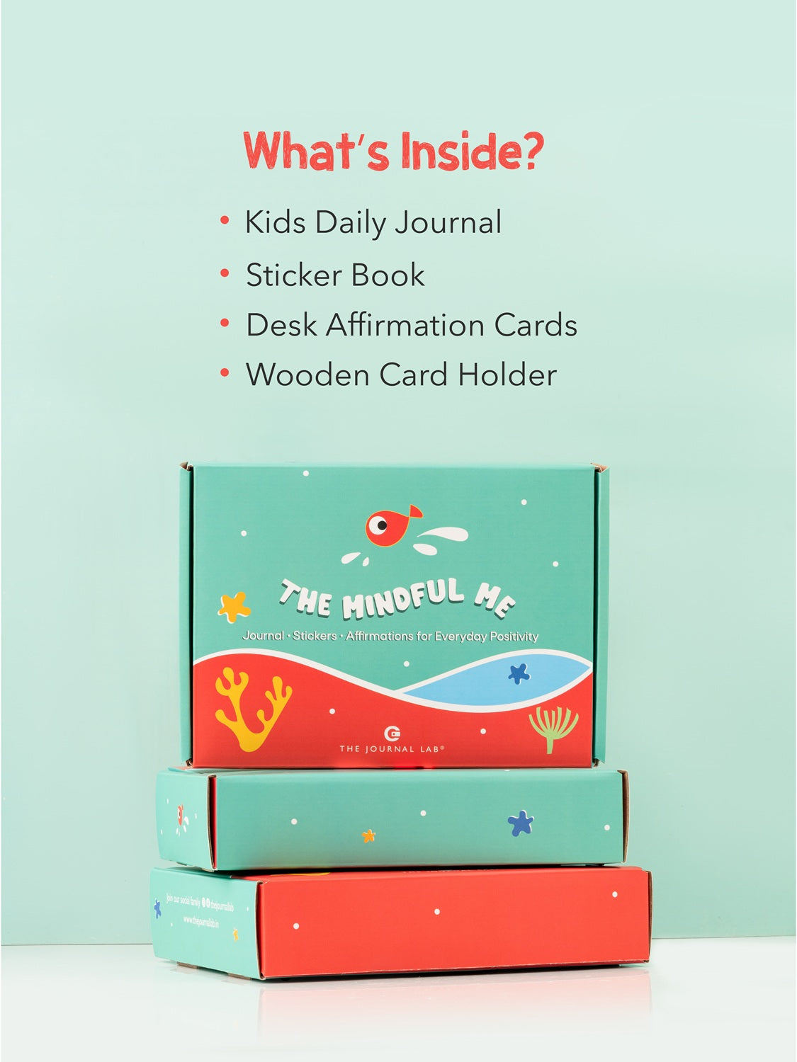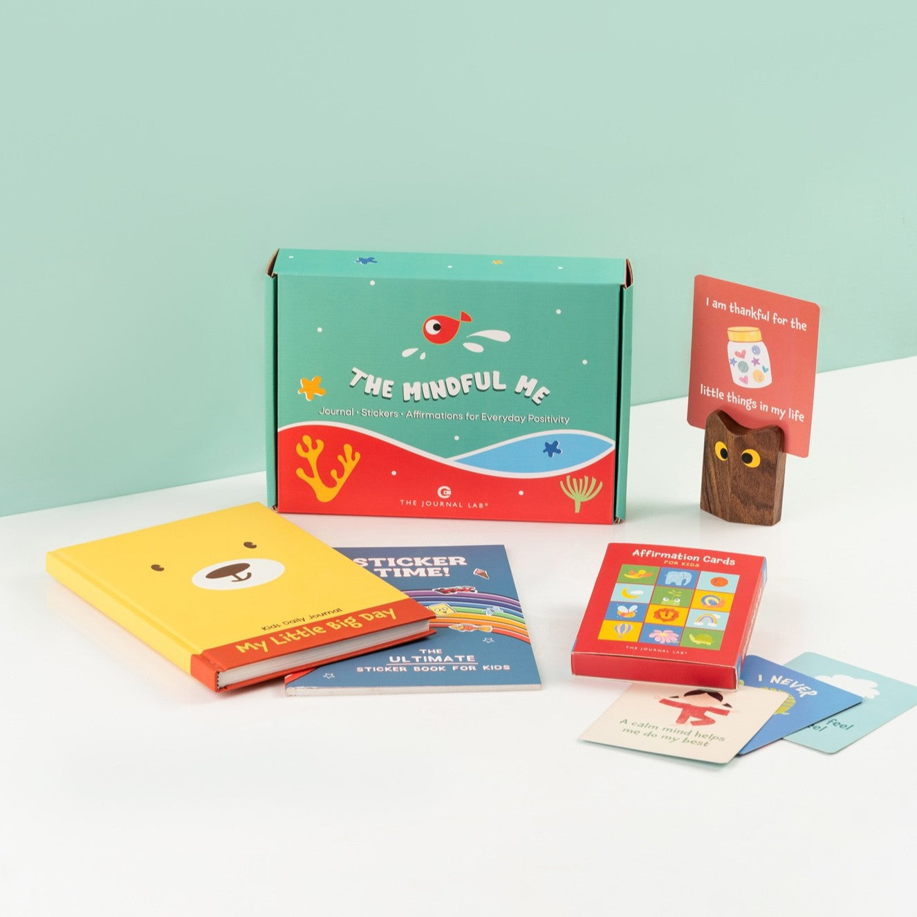 It includes a daily journal for kids, sticker book, affirmation cards set, and a wooden card holder - everything they need to make each day a little brighter.